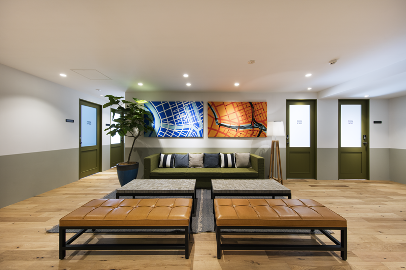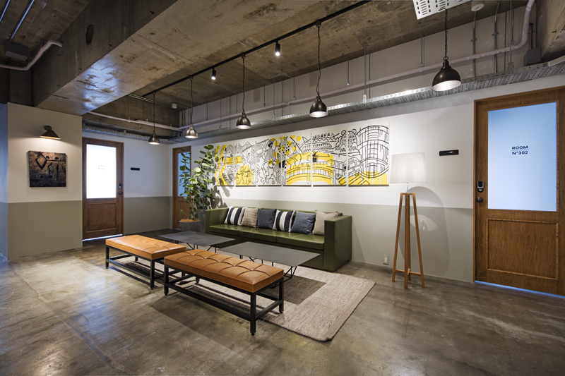 各階のラウンジは、少しずつ仕上げや照度を変えていくつかの空間を用意することで柔軟な使い分けができるように計画しました。各個室は既存躯体を活かした最低限の設えとして天高3.2mを中心としたゆったりとした空間となっています。利用されていなかった屋上も改修して休憩などに活用でき、施設内には「日本橋」をキーワードにしたアートが各階の共用部に設置されています。