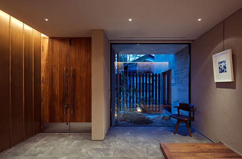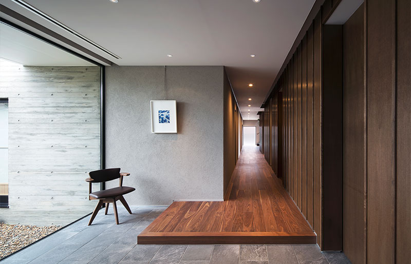 プライバシーを高めた個室に対し、開放的なリビングルーム。海外からのゲストも想定したおもてなしの茶室や眺望を楽しむテラスは、日々の暮らしだけでなくそれ以上に豊かな暮らしを得ることができる。大きな住宅では長くなりがちな動線に対し、コンパクトな移動を可能とするようにエレベーターを中央に配置。一方で住宅のヴォリュームを感じられるように玄関から20mの長い廊下を設けている。廊下が単調な移動になることを避け、空間の期待感を高めることができるように、その先の階段ホールは2階からの光が降り注ぐ、広がりのあるスペースとした。