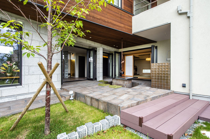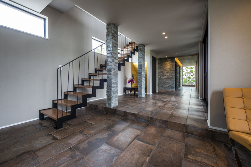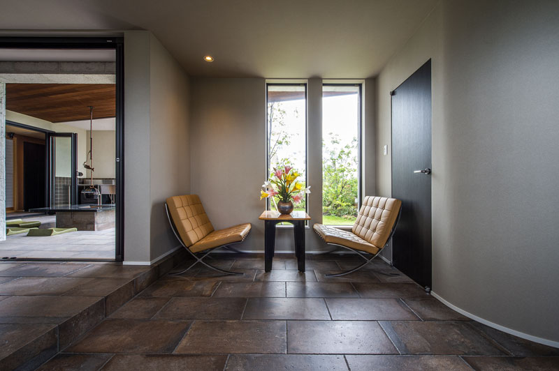 また仕事柄海外に行く機会も多くデザインには是非とも『和』のニュアンスを散りばめて欲しいというオーダーのもとに、掘り炬燵の屋外囲炉裏は縁側を挟んで和室へとつながる構成とした。エントランスホールとも大きな開口で繋げることで人の集まる場所の中心と捉えた。