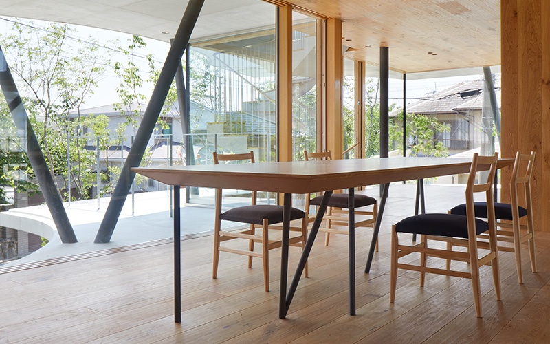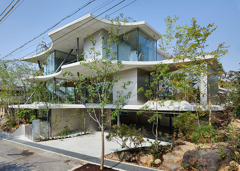 従来の壁、柱から解放された各層は、通りの並木や庭の樹木の成長を想定した気積を避けてカーブし、風や光を受け渡すような形態が現れた地形として積層されていく。