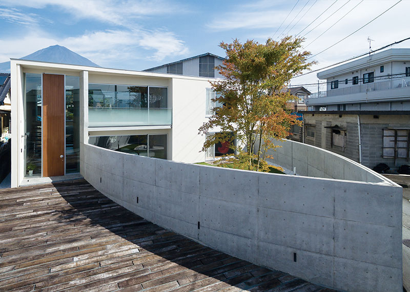 来訪者はプライベートエリアを守る円弧状の壁に沿って奥へ導かれ、高さ5mの扉を介して正面間近に雄大な富士山を望む玄関空間に入る。玄関ホールには表・裏の玄関を設けることで母屋へと通じる動線を確保し、その関係性を確立させた。