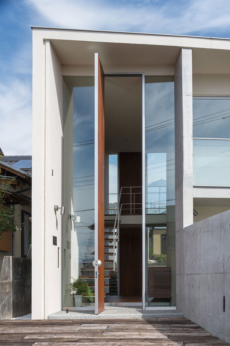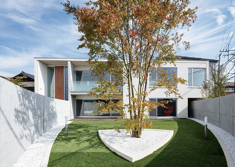 この三角形の敷地上に半径21mの交差するふたつの円弧をプロットし、その円の中心を結ぶ軸線上に円弧を跨ぐように台形平面+門型立面の住宅ヴォリュームをプログラムする。このふたつの円弧が重なり、その円弧上に建てられた湾曲するコンクリート壁で囲まれたエリアは、シンボルツリー(イロハモミジ)が植えられた前庭や裏庭と共に家族のための空間を内包し、プライバシーが保たれた安定した居住性をこの住宅にもたらしている。またこの象徴的なコンクリート壁は、ガラスの素材感が際立つ門型の住宅ヴォリュームと一体となって、この建築の印象的な造形を創り上げる。