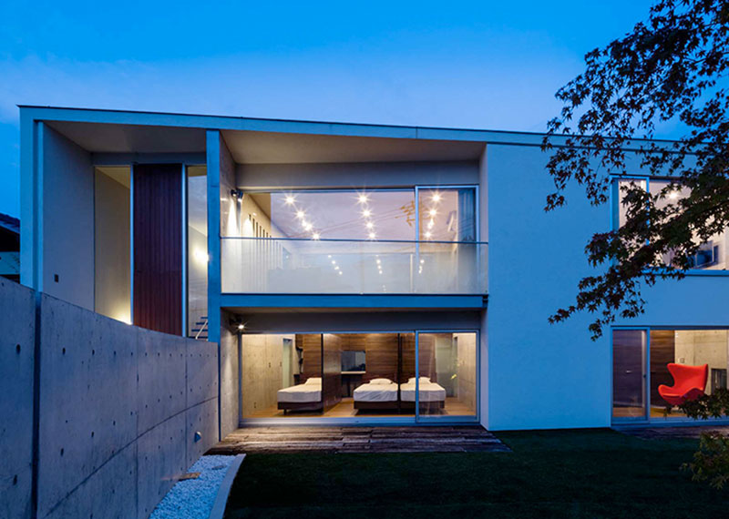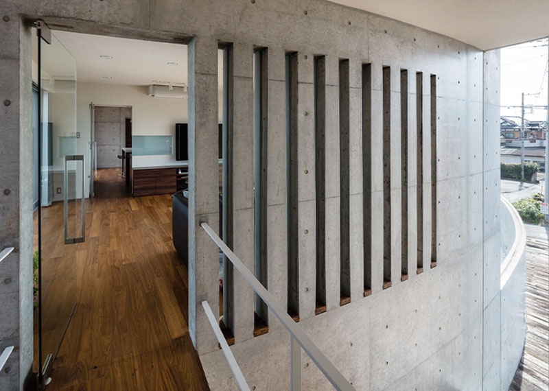 ご夫婦と3人の子供たちのための住宅である。コンクリート打ち放しにこだわりをもつご主人の要望から、基本構造フレームはRC造とし、コンクリートとガラスの素材感を生かした象徴的な建築デザインを目指すこととなった。