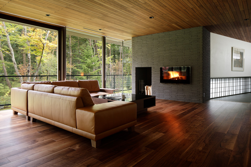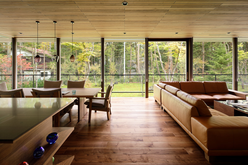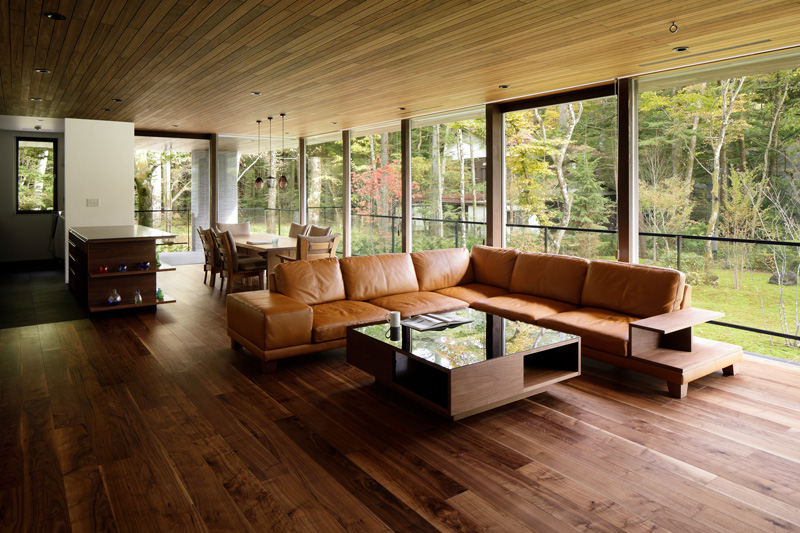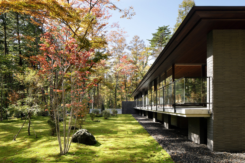 道路からガレージ、庭の高さ関係も絶妙で、これを活かした計画としています。居住スペースを地面から浮かせることで、半地下となる部分にガレージを用意しつつ、フロアレベルを地盤面からスムースに離すような空間的なしかけを生み出しています。これは旧軽井沢エリアでの湿気対策にもとても効果的です。道路と反対側の隣地は借景となるような森が残っており、道路側アプローチから敷地奥の隣地まで視線を切らずに見通せる配置計画によって、敷地の奥行を一層感じさせるものにしています。また、庭づくりは既存の樹木を活かしながら、目線に近い高さの中低木を植栽していき、緑が目に映り込んでくる軽井沢らしい自然な雰囲気をつくっています。