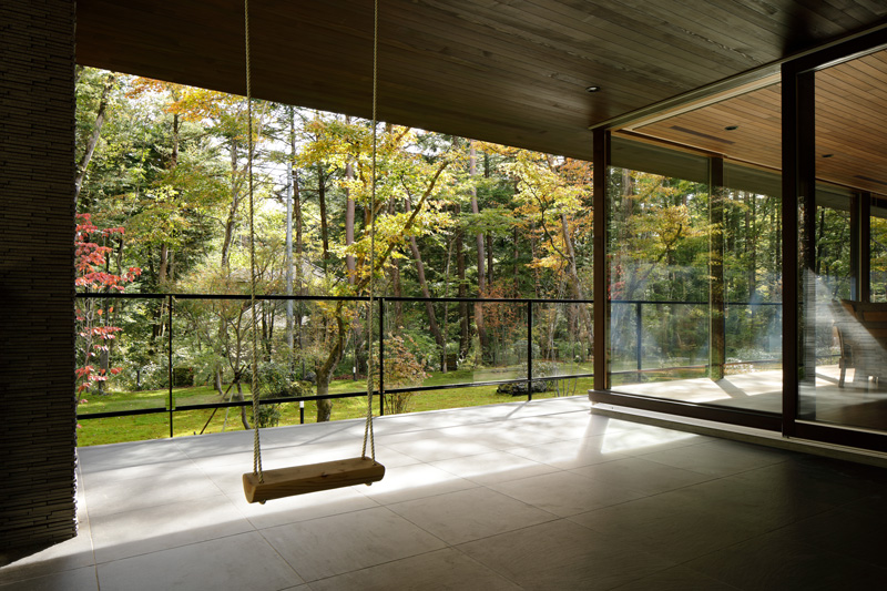 インナーテラスは敷地奥の借景を取り込めるように一番奥にレイアウトしています。Hさんがお持ちになったブランコは意外にも大人も楽しんでいます。
