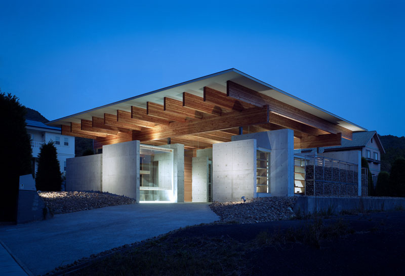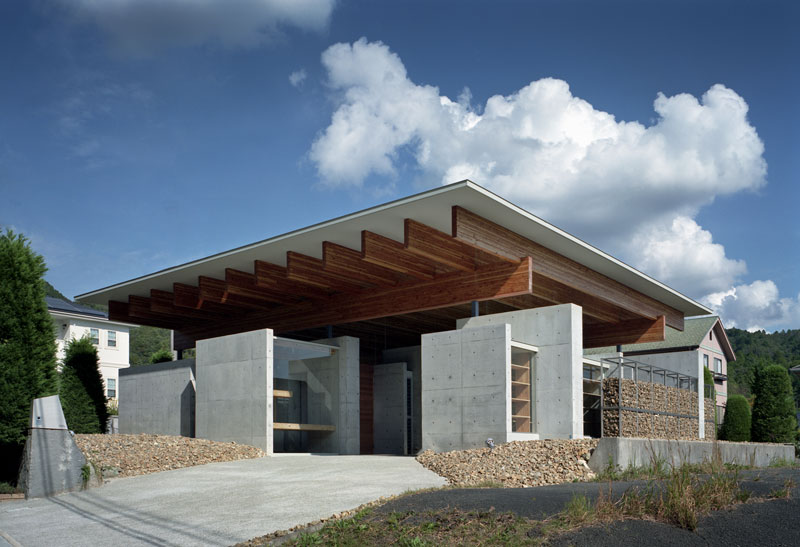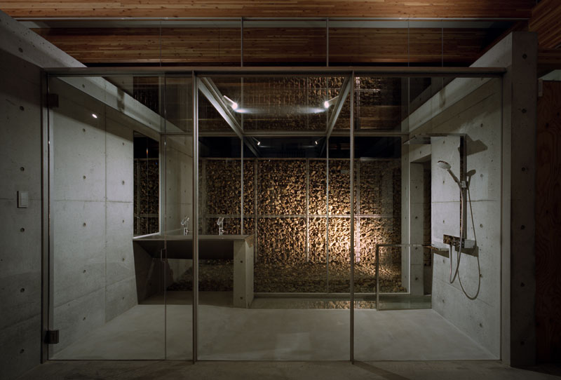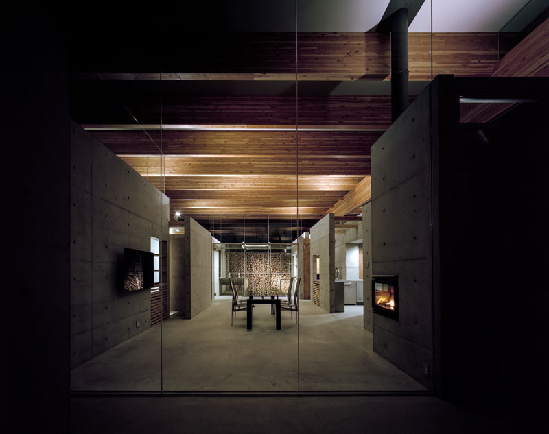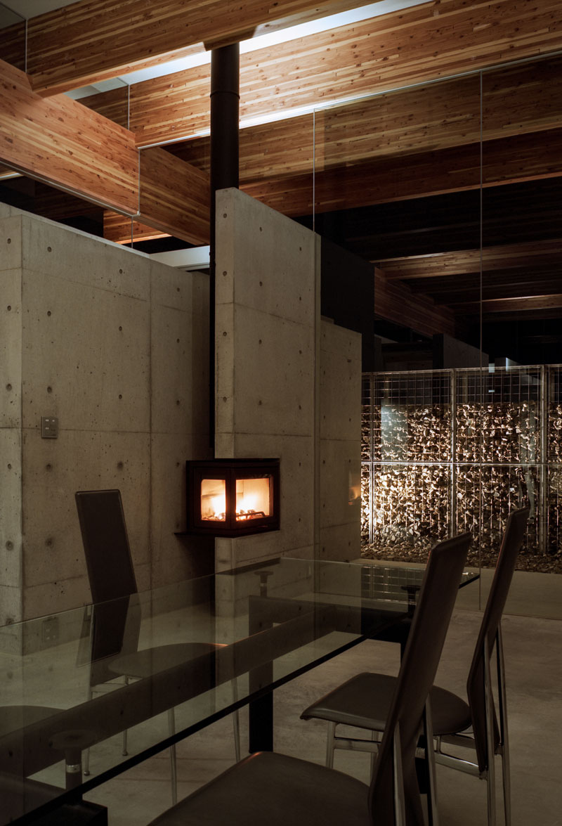 そこで、この住宅では、大屋根、大壁でざっくりと空間を分節し、その空間をガラス屋根や木造屋根、ガラス壁、木造壁、建具、ガビヨンなどのエンクロージャーで光や音、空気、動線、視線の透過と遮断をコントロールすることで居住する領域として成立させています。
