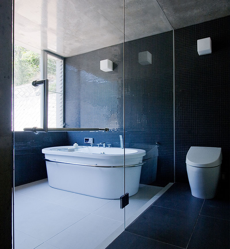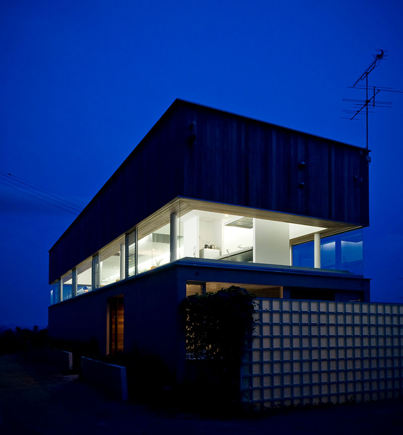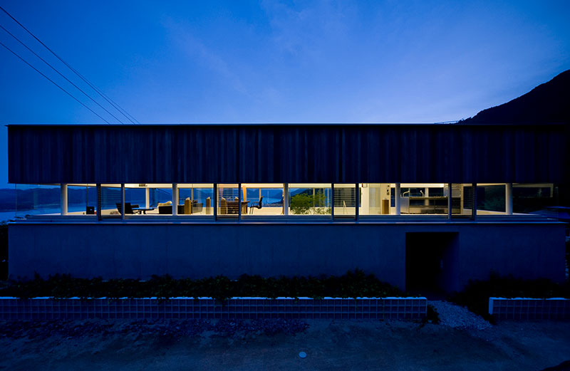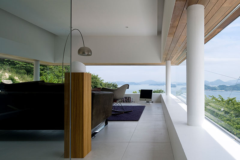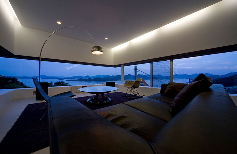 ここでは「時」を存分に堪能することが出来る。四季の移ろい・一日の移ろい・天気の移ろい~空と海、木々の色彩と影が、時を教えてくれる。陽がある時間帯のパノラマ的な美しさは格別であるが、月夜の晩も殊更に美しい。水面に映る白光は静謐であり、眼下の小さな町灯りと相まって趣深い。室内灯を消して月あかりに過ごせば、美しい異空間を感じることができるだろう。月のない夜にはキャンドルを灯しても素敵である。炎のゆらめきは四方のガラスに幾重にも映り込み、昼間とは違った表情を醸しだす。この建物は、敷地に委ねる感覚を大切にしながら計画されている。