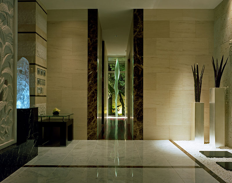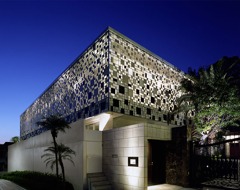 母屋は、プライバシーを守りながら、周辺環境へ開く建築になるよう、ランダムな開口を持つ特徴的なデザインを採用しています。昼は数種類の石のテクスチャーを楽しみ、夜は室内の照明によって幾何学的なシルエットが浮かび上がり、地域の行灯としての役割も果たしています。水盤に囲まれた1階は、どこからも水を感じられるように計画され、アジアンリゾートのような親水性を意識したつくりにしています。
