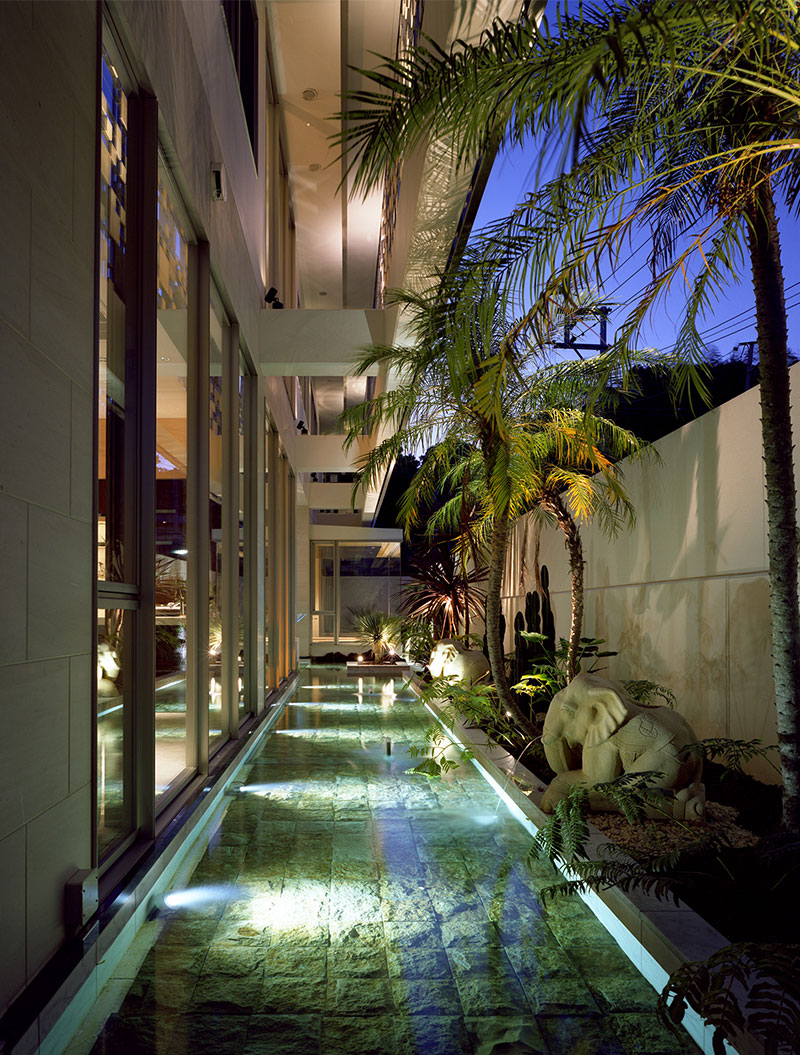 緑に囲まれた敷地内には高低差が10m程あります。その高低差を利用して、敷地の一番高い場所に、離れと露天風呂を配置して近隣の森全体を眺める眺望を確保し、斜面中腹には屋内プールを埋込んで側面を水槽のようにアクリルで仕上げ、使用していない時も山肌に水を感じられるようにし、下方に駐車場を埋込み、屋根は庭から上がれるようになっています。その斜面に対峙する形で敷地の低い位置に母屋を配置し、その母屋から眺める斜面は点在する建築と植栽により、「立体庭園」としてこの住宅の見せ場となっています。