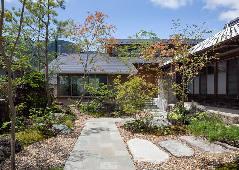 迎門をくぐり、屈曲した長いアプローチがある前庭が、新旧の建物を緩やかに融合してくれる。瓦葺で大きな切妻屋根の母屋の屋根形状を継承し、母屋と同じく4寸勾配の切妻屋根を、近代の素材であるガルバリウム鋼板横葺きで次世代へ繋ぐデザインとした。