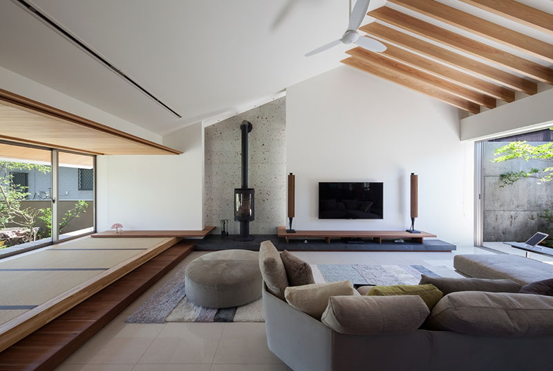 LDKは、勾配天井やさまざまな天井高、床の段差を設けることで空間に変化をもたらし、ほどよく分割し、家族にさまざまな居場所を作った。どの場所からも庭の木々が見える空間である。