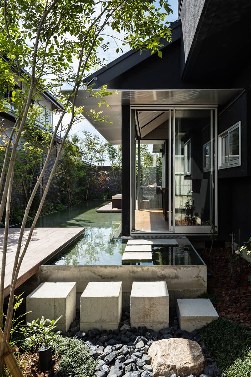 木造住宅ゆえに庭の地面と内部床のレベル差が大きく、普通に水盤をつくると、腰かけた視点から水面が見えなくなります。テラス面を1階の床レベルまで上げて、水面もそのレベル近くに設定して親水感を強めました。庇を延ばして内部からの視界を絞りこむことで、隣の建物の近接による現実感を解消しました。庇は直射日光を遮ること、軒下が広がり内外をよりスムーズに繋ぐことのためにも効いています。