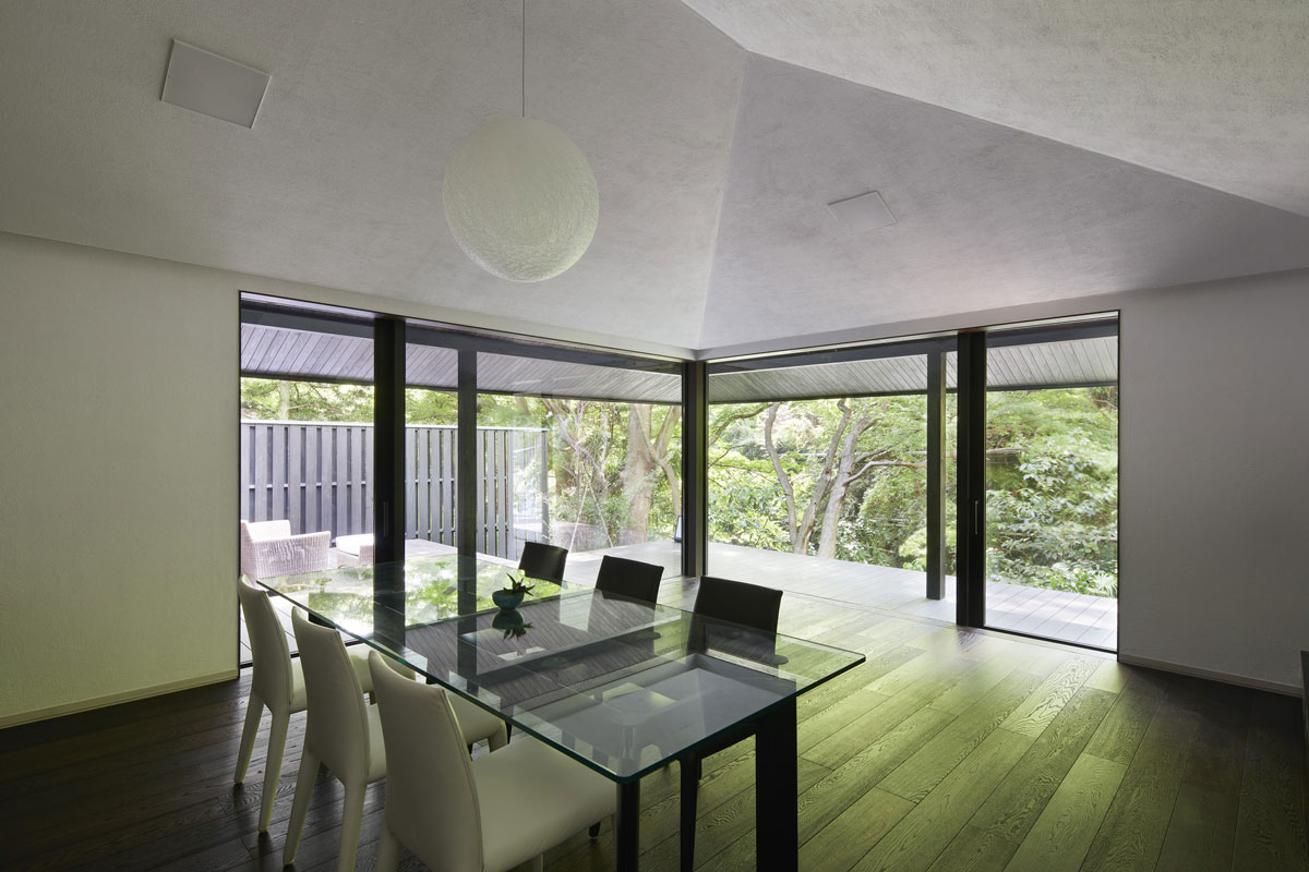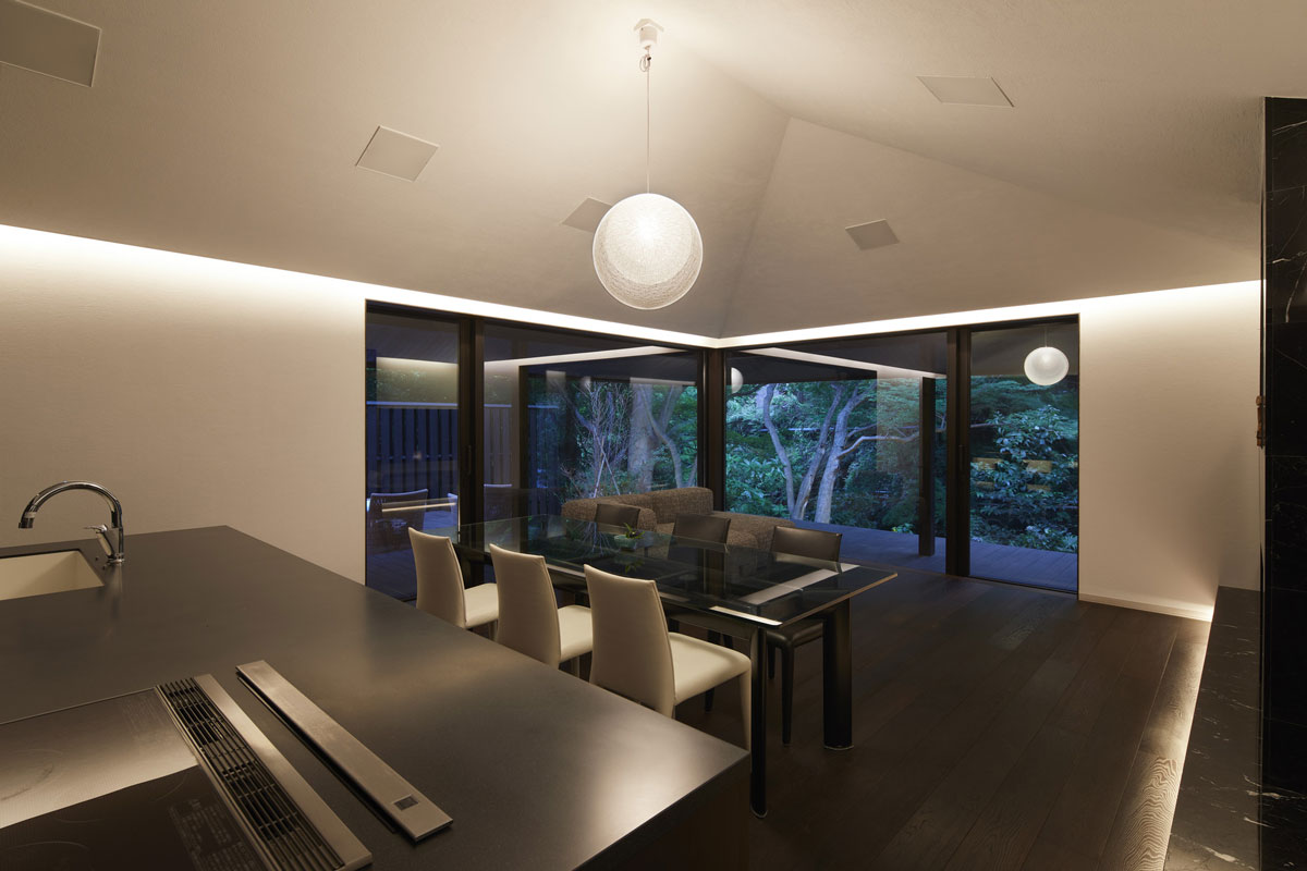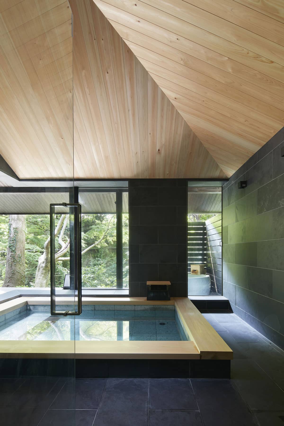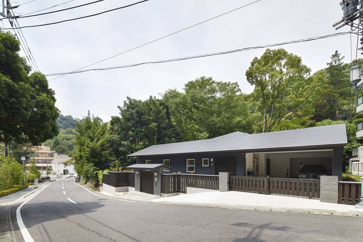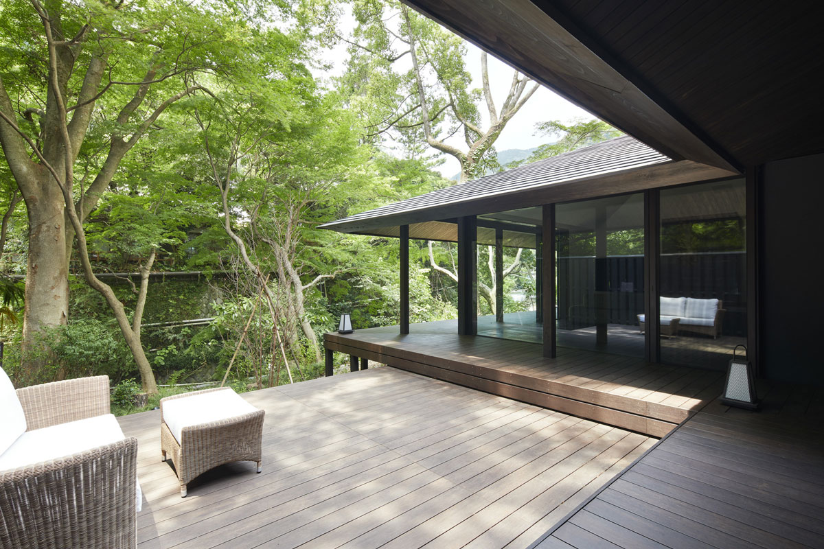 軒下の縁側とひと続きのリビングや温泉から見える風景は湯河原の町の豊かな緑と川だけです。それは雑多に点在するものがある風景の中から、素敵な景色だけを抜き出す演出を大きな軒下が一役買ってくれているからです。