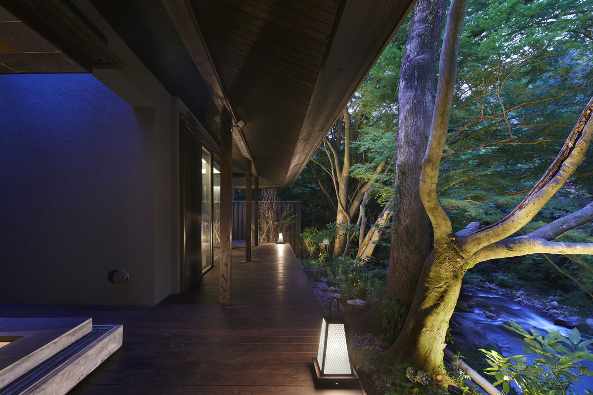 湯河原の町を流れる千歳川。その川の流れを眺めながら時間を過ごすことが出来るその建物は、大きな軒が出ています。その軒下にある壺温泉やアウトドアソファで、寛ぎながら川の流れる音を聞くことが出来る建物です。
